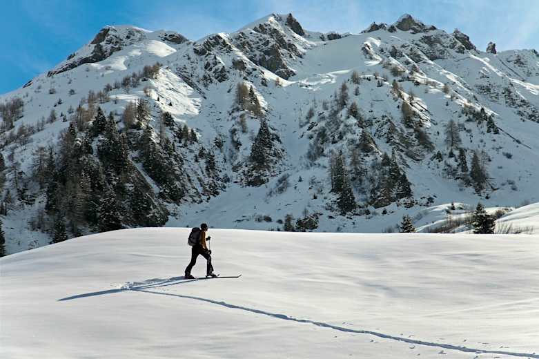 1) Die anspruchsvollere Route führt vom Kreuzjöchl über den Kamm kurz Richtung Ost, dann über herrliches Skigelände zur Klammalm (1.947 m) oder etwas westlicher zum Klammbach. Über eine Brücke gelangen wir auf die rechte Talseite. Kurzer Gegenanstieg auf einem Almweg, dann wieder über freie Hänge zum Klammbach hinunter, den man neuerlich überquert und zum Parkplatz hinausfährt.