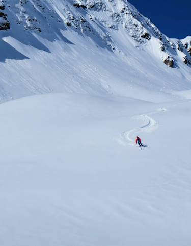 Die Abfahrt führt entlang der Aufstiegsspur. Wer eine andere Route möchte, fährt via „«Längelowene“ und „Höji“ zurück nach Lauenen. Alternativ geht’s auf der anderen Seite hinunter nach Gsteig.