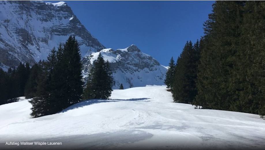 Im Anstieg auf die Walliser Wispile mit ihren 1.982 m im Kanton Bern in der Schweiz findet man fast immer sehr gut Bedingungen. Vor allem, wenn aufgrund von viel Neuschnee viele anderen Touren wegen der zu hohen Lawinengefahr nicht möglich sind, bietet sie eine willkommene leichte Tour in relativ sicherem Gelände.