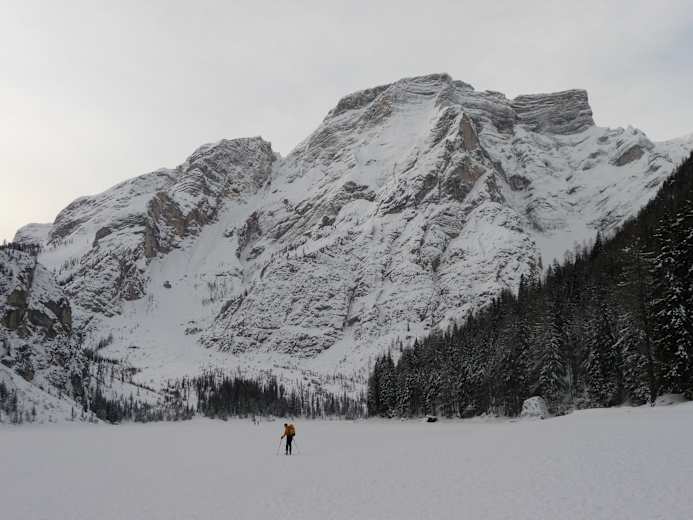 Die Aussicht vom Gipfel ist einfach umwerfend und sollte Ansporn sein, unbedingt durchzuhalten. Im Norden blickt man auf den Pragser Wildsee hinunter, während sich im Süden die Fanes-Hochfläche in ihrer ganzen winterlichen Pracht zeigt.