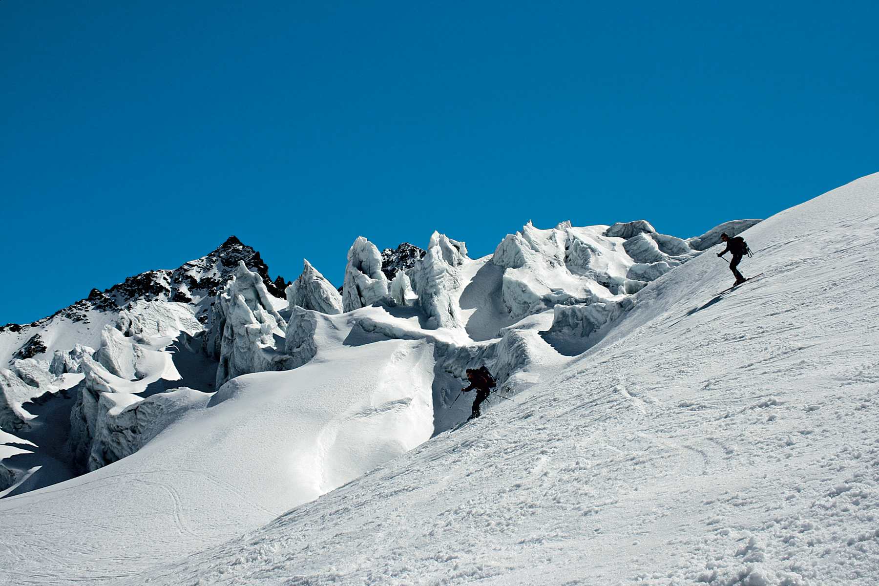 Bei der Abfahrt wählt man erst die Aufstiegsroute und folgt dann den schönen Skihängen des Ochsentaler Gletschers bis in den Talboden auf etwa 2.300 m Höhe. Von dort aus entweder in knapp 30 Minuten Anstieg zurück zur Hütte oder weiter durch das Ochsental hinaus zur Bielerhöhe.