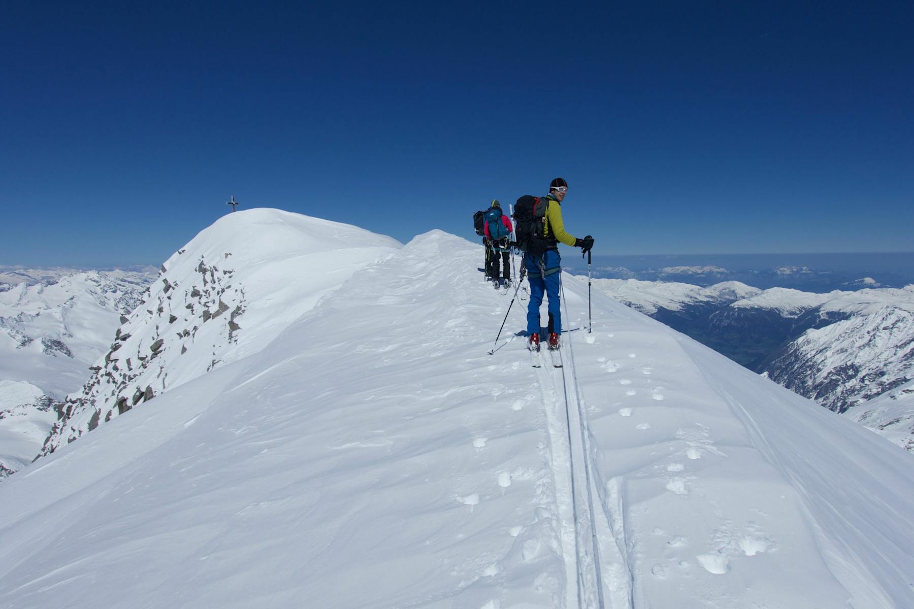 Schier endlose Firnabfahrt: Der Großvenediger ist nicht nur einer der höchsten Gipfel der Ostalpen mit charakteristischer Form und entsprechend prominent von vielen Orten aus eindeutig zu identifizieren, sondern auch ein schönes Skitourenziel. Von Norden, von Osten und Süden führen Anstiege hinauf, die aufgrund der weitläufigen, teils flachen Gletscher gerne mit Ski unternommen werden. Einschränkend muss man jedoch auf die Spaltengefahr hinweisen, die es bei allen diesen Routen zu beachten gilt. Der Venediger gehört zu jenen Gipfeln, die besonders viele Spaltenunfälle aufzuweisen haben.