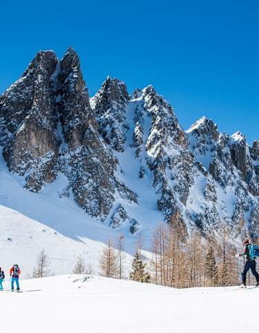 Der breite Weg führt zur Skipiste, an der man nach rechts abbiegt und der Skiabfahrt leicht bergab bis zur Zapferlalm folgt. Die Aufstiegsspur zweigt nach links ab und führt hinter der Talstation der Kings Cab Bahn bergauf. Man genießt die schöne Natur abseits der Pisten und folgt dem präparierten Weg weiter bergan bis man die Skitourenaufstiegsspur, welche vom Dientner Sattel herauf führt, kreuzt. Nun folgt man dieser Strecke, die unterhalb der Gondelbahn verläuft noch eine Weile bergauf bis man zum Ziel der heutigen Tour, der Bergstation der Kings Cab Bahn, gelangt. Hier angekommen genießt man den herrlichen Blick auf das Hochkönigmassiv und die umliegende verschneite Bergwelt.
