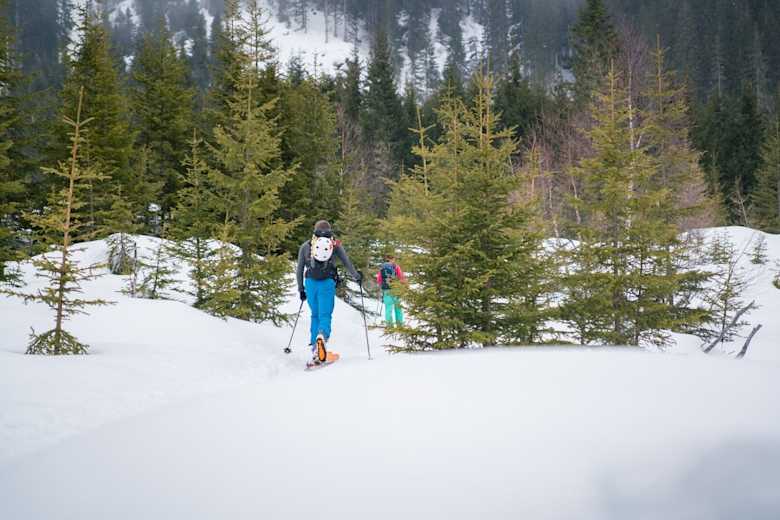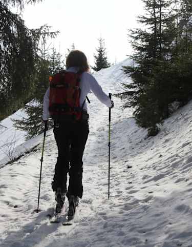 Die Skitor auf die bewirtschaftete Jungeralm im Gasteinertal nimmt ihren Ausgangspunkt bei der Talstation des Skizentrums Angertal. Sie führt aber abseits der Pisten durch den winterlichen und stillen Wald aufwärts.