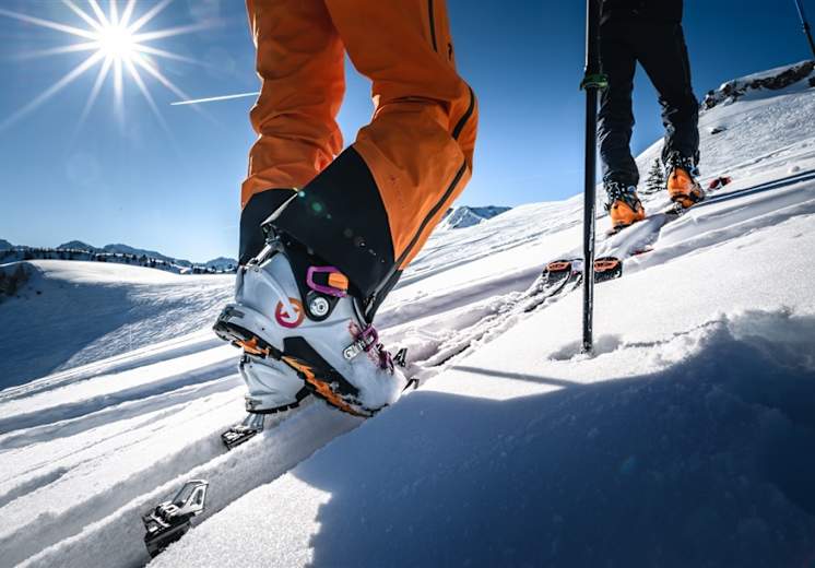 Einfache Skitour mit sichtbaren, grünen Wegweisern – verläuft von der Bergstation des Champion Shuttle im Skigebiet Shuttleberg bis zum Gipfel des Mooskopfes - ein hochgelegener Aussichtspunkt, von dem man ein atemberaubendes Bergpanorama genießen könnt.