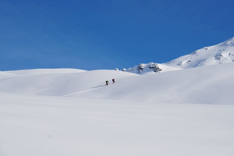 Die Abfahrt erfolgt entlang der Aufstiegsspur zurück zum Tschuggen.