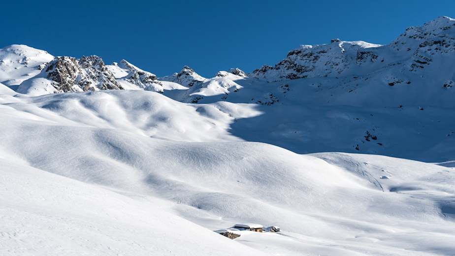 Tief verschneite Alm am Weg zum Gorihorn Foto: Bergführer Davos Klosters, Destionation Davos Klosters Bildergalerie (4)