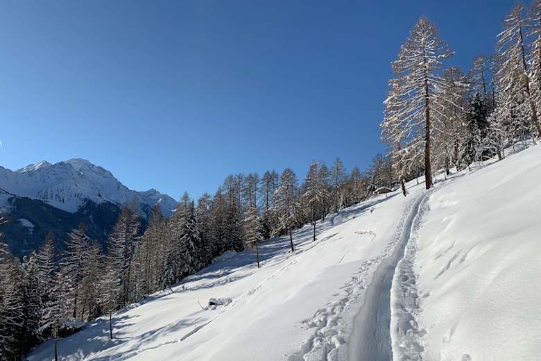 Der erste Teil der Route führt hinauf zu den Höfen von Pfurtschell (1.300 m). Je nach Schneelage gibt es dafür zwei Optionen: etwas schattiger, von der Brücke der asphaltierten Bergstraße (1.160 m), über freie Bergwiesen, oder etwas weiter südlich davon, mit Abzweig im Bereich der Pension Jedlerhof.