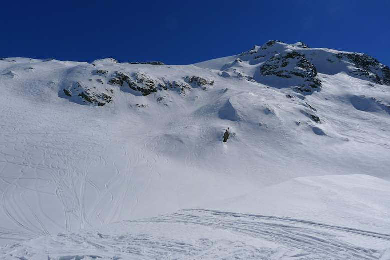Von der Diavolezza Bergstation (2.972 m) fährt man bis zu 2.845 m ab und quert dann möglichst die Höhe haltend unterhalb der Felsen durch. Nun steigt man relativ direkt zum Gipfel auf, wobei die genaue Routenwahl von der Schneesituation abhängt. Bei stabiler Lawinensituation kann man auch ohne erst abzufahren direkt von der Bergstation dem Wanderweg zum Gipfel folgen.