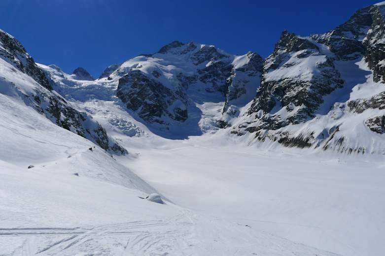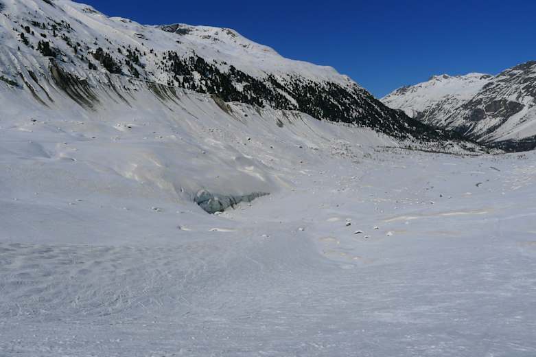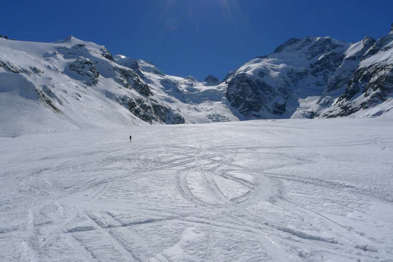 Die Abfahrt ins Morteratsch führt über einen Gletscher. Sind die Bedingungen auf dem Gletscher schlecht oder fehlt die entsprechende Erfahrung, stellt die Abfahrt zur Bergstation und weiter über die Pisten zur Talstation eine gute Alternative dar.