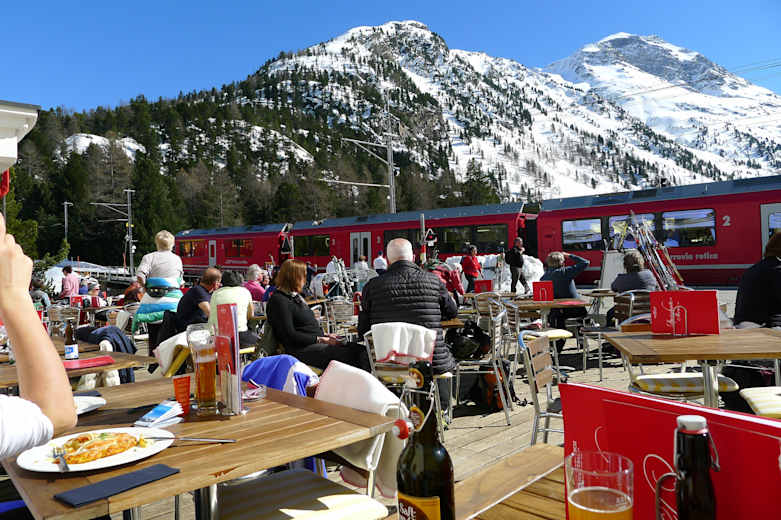 Ein Bier und/oder ein Stück Kuchen auf der Terrasse des Gletscher-Hotel Morteratsch rundet die Tour ab und überbrückt das Warten auf den Zug zurück zum Ausgangspunkt.