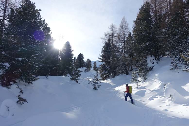 Für die hier beschriebene Nordostabfahrt sind absolut sicher Lawinenverhältnisse notwendig – davon zeugen auch die beiden Lawinenrunsen Laviner Grond und Laviner Pitschen.