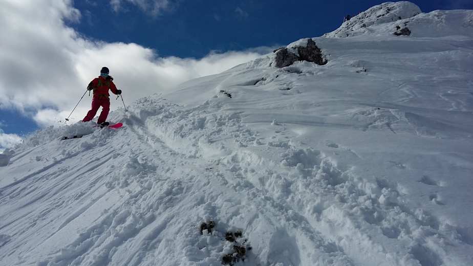 Die Abfahrt folgt entlang der Aufstiegsspur durch das wunderbar gleichmäßige baumlose Kar.