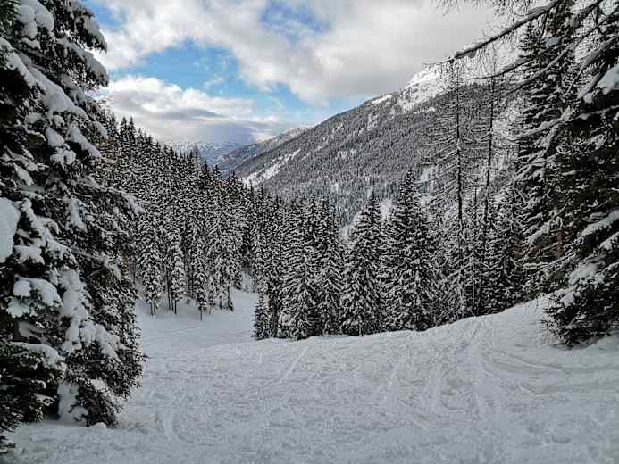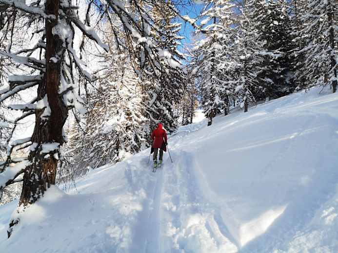 Von dort über einen Forstweg talauswärts gehen, bis man auf die Aufstiegsspur trifft.