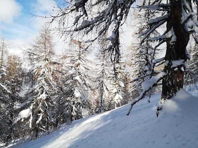 Tief verschneiter Lärchenwald am Rauhen Kopf Foto: TVB Wipptal, Benjamin Jenewein