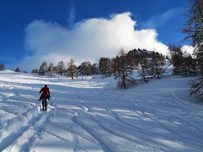 Vom Ausgangspunkt gehts zunächst geradeaus über eine Wiese aufwärts, quert am oberen rechten Ende einen Forstweg und folgt der Waldschneise bis zu einer Gabelung. Dort hält man sich links und steigt über das weniger steile Gelände weiter auf. Der Weg führt jetzt leicht rechts durch lichten Lärchenwald bis unter einem runden Berg mit Zirbenbäumen, dann hält man sich links auf dem Bergrücken und steigt die letzten Meter zum Gipfel auf.