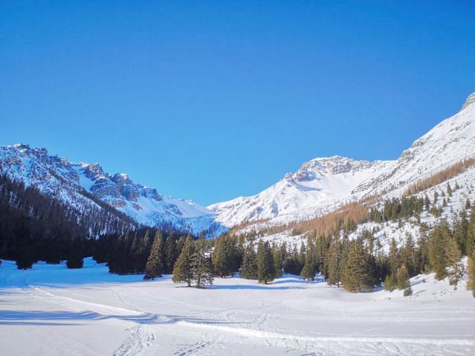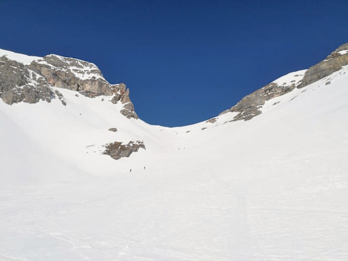 Abfahrt im oberen Bereich leicht östlich der Aufstiegsspur in südlicher Richtung. Der Großteil der Flanke hat an ihrer unteren Seite einen Felsabbruch, nur an einer schmaleren Stelle ist diese mit den Ski zu überwinden. Im weiteren Verlauf kann man die weite Geländeformation nach Belieben ausnützen, der ein oder andere etwas steilere Hang ist allerdings mit Vorsicht zu genießen. Ab der Ochsenalm folgt man dann dem Rodelweg zurück nach Mützens.