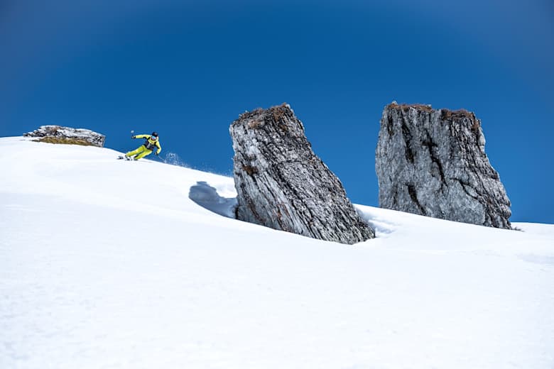 Für die Abfahrt durch die Westflanke müssen perfekt und sichere Verhältnisse vorherrschen. Ein toller Hang knapp über 40 Grad Neigung verspricht eine rassige Abfahrt. Von dort folgt man der Aufstiegsroute zu Segneshütte oder nimmt via Fuorcla Raschagluis die lohnende Abfahrt nach Bargis in Angriff.