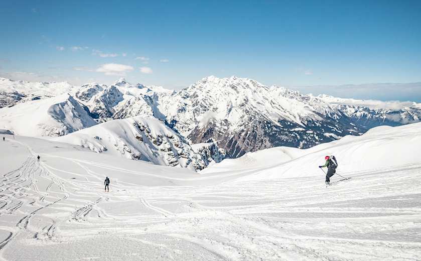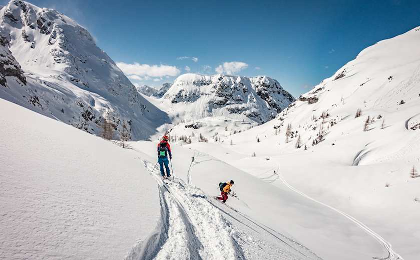 Die Kleine Reibn im Berchtesgadener Land ist ein Skitourenklassiker. Die mittelschwere Tour führt auf den Schneibstein und anschließend durch eine großartige Landschaft bergab. Die Anreise geschieht idealerweise mit öffentlichen Verkehrsmitteln.