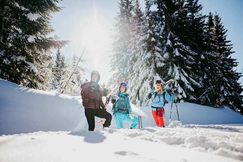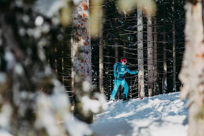 In einer wunderbaren Winterlandschaft verläuft der Pfad nun flach bis zur Bergstation der Papageno Gondelbahn, wo man in der Schörgi Alm einkehren oder sich im Langlaufhaus umziehen kann.