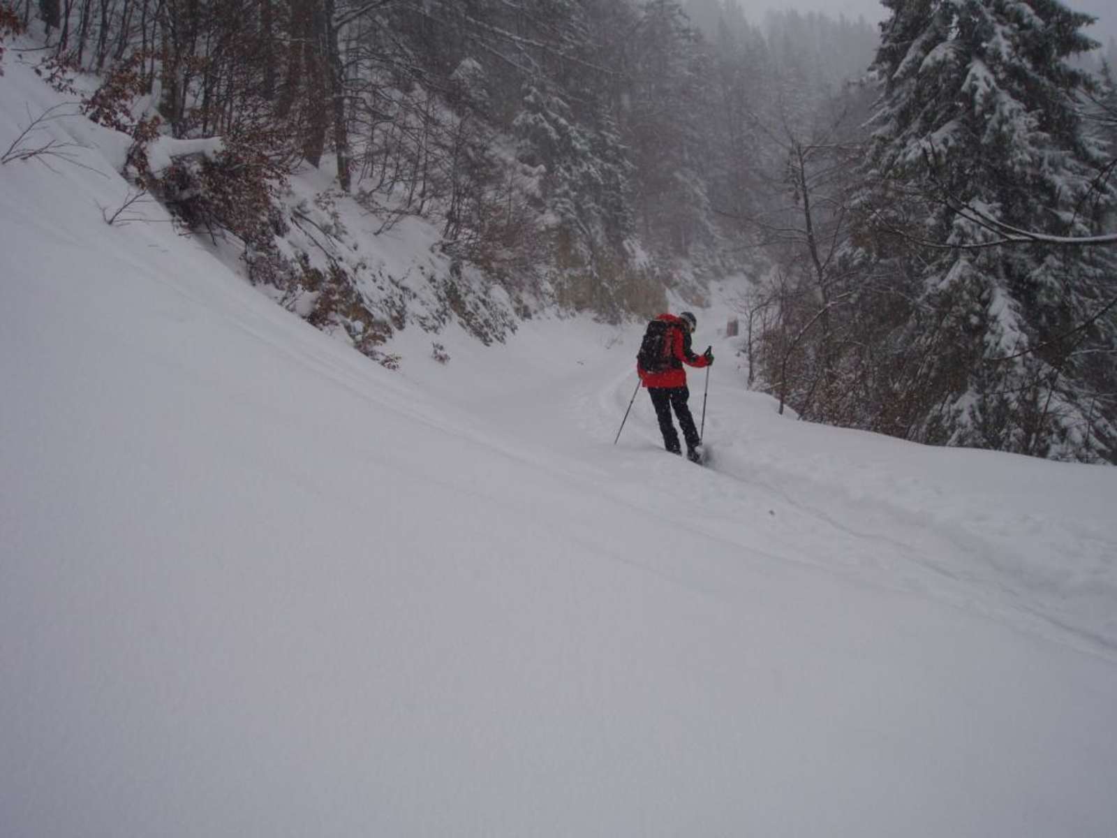 Der obere Bereich der Sterngasse ist mit Vorsicht zu befahren. Bei hoher Lawinengefahr ist die in der Abfahrt gesehene linke Seite eventuell unsicher, daher eher rechts halten! Im Sterngassl Querung einer neuen Forststraße auf ca. 1.250 m. Weiter die Sterngasse abwärts folgen bis bei ca. 1.050 m ein Wendeplatz ereicht wird. Hier auf linker Seite ein Gedenkkreuz aus Holz, für einen in der Sterngasse tödlich verunglückten Schifahrer. Man folgt dem Wegweiser (Eibl), der nach links in einen Schiweg zeigt. Dieser quert leicht abfallen die linke Waldflanke und führt nach einer markanten Wende direkt zur Bergrettungshütte Österleinbrunn, die auf einem kleinen Sattel mit Wiese steht. (Bergrettungshütte der Ortsstelle St. Pölten ca. 1.040 m, schöner Rastplatz). Hier wieder anfellen und dem markierten Weg folgend bis zum Karnerhofspitz (1.124 m). Alternativ könnte auch die nicht markierte Forststraße, die um den Karnerhofspitz führt, begangen werden. Dies ist aber weniger lohnened (geringere Aussicht und nur langweilige kürzere Abfahrt).
