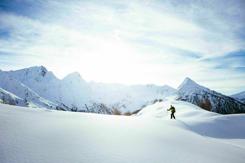 Die Skitour von der Schneeberger Brücke auf das Kaindljoch führt durch eine bezaubernde Landschaft und in ein Stück Südtiroler Bergbaugeschichte und bietet immer wieder beeindruckende Blicke auf die imposanten Gipfel der Stubaier und Ötztaler Alpen.