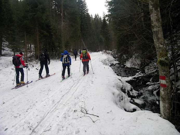 Bei wenig Schnee auf 1.180 m besser auf der Forststraße bleiben und in Kehren zu einer Jagdhütte, 1.350 m, und rechts flach zur Einmündung in den direkten Waldaufstieg bei einem Graben, 1.380 m. Weiter wie oben zum Karl-Lechner-Haus.