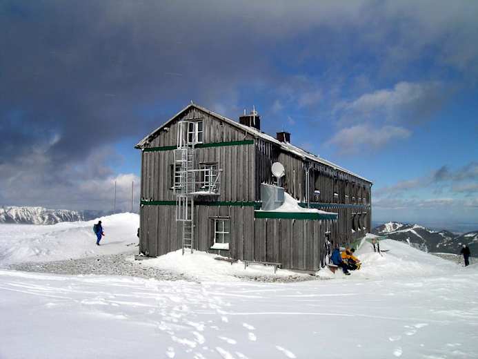 Weiter im schönen Hochwald nach SO (gelber Wegweiser). Bald über eine markante Lichtung, an ihrem oberen Rand (Schild auf Baum) rechts und ansteigende Querung auf eine Lichtung, 1.600 m. Bereits hier sollte man gegen Kälte und Wind vorsorgen. Nun weiter nach SW in schräg ansteigender Traverse an die Waldgrenze, 1.660 m (rechts Wasserreservoir) und zunehmend baumfreier, aussichtsreicher und oft stürmischer, aber sanft aufwärts zum bereits längst sichtbaren Alois-Günther-Haus auf dem Gipfel. Dort zwei mögliche Eingänge an den beiden Längsseiten der Hütte. 1 Std.