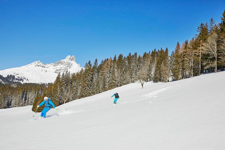 Die Abfahrt erfolgt entlang des Aufstiegsweges oder man benützt die schmale Schneise der ehemaligen Lifttrasse. Im untersten Teil kann man rechts neben dem Aufstiegshang einen weiteren sehr schönen Hang für die Abfahrt wählen.