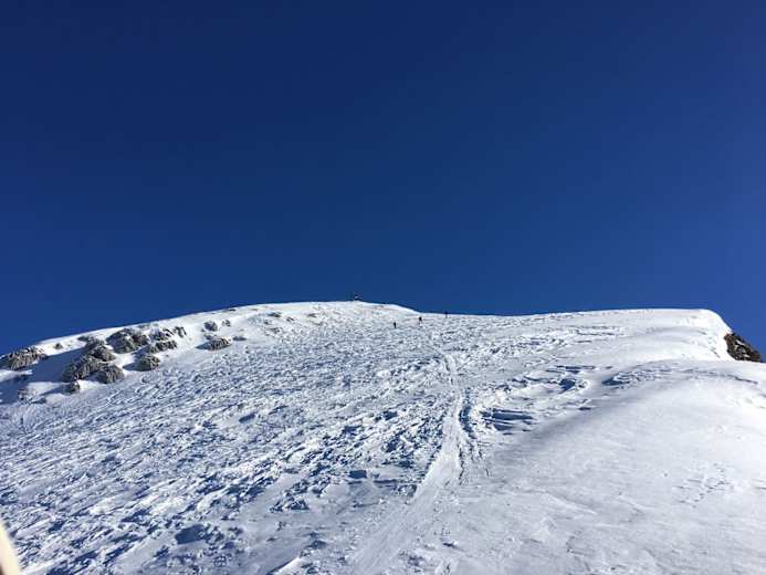 Oberhalb der Baumgrenze im freien Gelände den offenen Hang entlang aufsteigen, diesen links queren, am Sennerin Kreuz vorbei und dann über den kleinen Felsen wieder rechts. Von hier aus ist der Gipfel wieder zu sehen (rechts unten liegt der Dießbachstausee). In ca. einer halben Stunde über den flachen Hang zum Gipfel mit herrlicher Aussicht! Die abwechslungsreiche Skitour schließt mit einem nordostwärts ausholenden Bogen ab.
