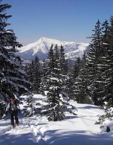Auf die Große Proles:Vom Freinerhof an der Kapelle vorbei zur Bundesstraße und auf ihr zum Waldrand. Rechts abzweigen auf die Forststraße und (nur bei ausreichend Schnee) bald links im Wald beliebig nach S höher, die Forststraßen mehrfach kreuzend. Auf 1010 m auf der Forststraße rechts zum Hammergraben und an einem Felsen vorbei weiter nach W um einen Rücken. Beim folgenden Rechtsbogen, 1100 m, links ab in eine schlanke Schneise, die sich zunehmend aufsteilt und verengt. Daher links ausweichen und hinauf zur Forststraße, 1200 m. Die folgende Kehre abschneiden und zum folgenden Rechtsknick, 1250 m. 1 ½ Std.