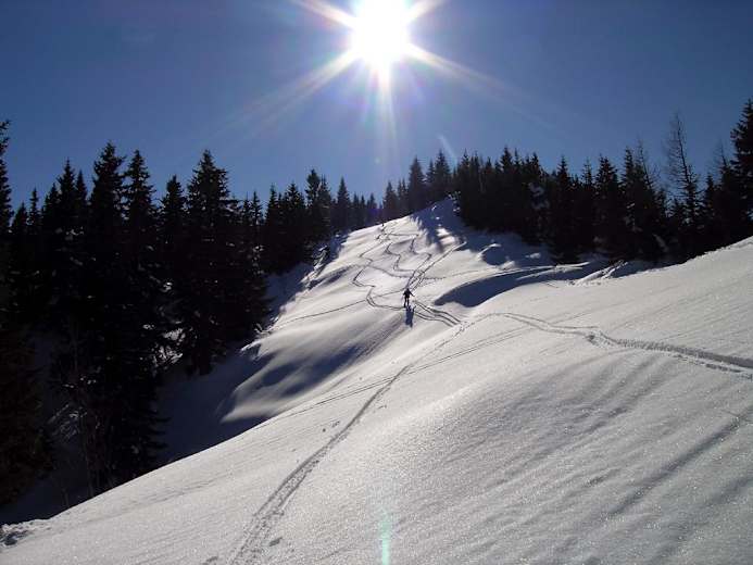 Abfahrt nach Frein: Vom Kreuz sanft fallende Querung nach OSO unter den Sender und weiter, bis oberhalb die Wechten der Südostflanke auftauchen. Nun nicht in die Flanke, sondern zunächst über den Rücken hinab. Im lichten Wald mit Linksdrall in die Mulde. Durch diese zu einer ersten Forststraße, 1250 m. Auch die nächste kreuzen und zur dritten (980 m). Auf dieser rechts mit zwei Kehren zurück nach Frein.