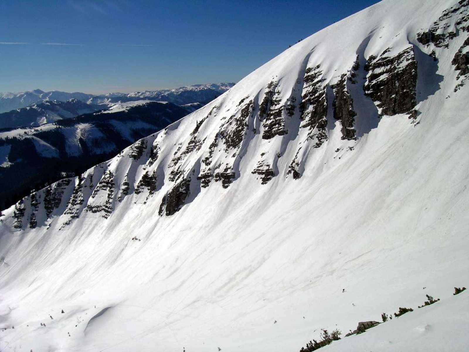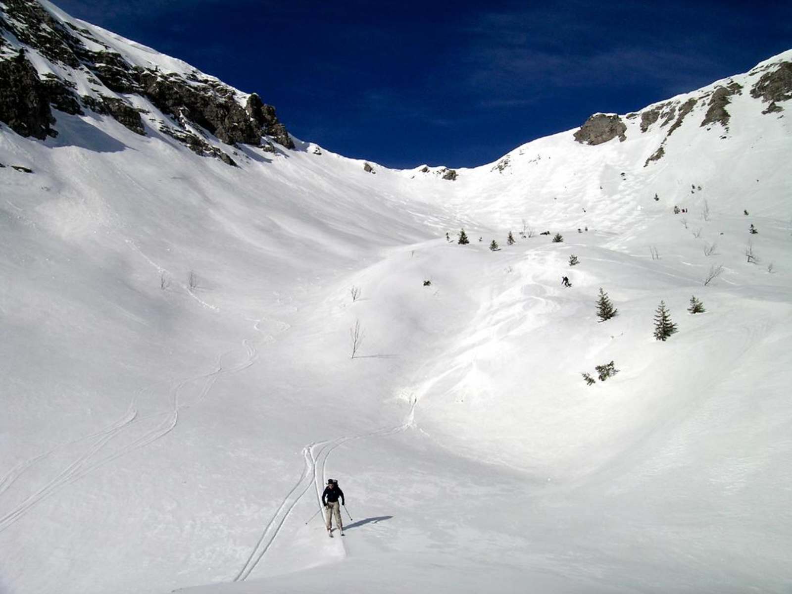 Aufstiegsvariante: Auch der direkte (und daher kürzere) Aufstieg durch die Karlgrube selbst ist möglich und empfehlenswert. Sehr steil ist dabei der Ausstieg in den überwechteten Sattel (eventuell die letzten Meter abschnallen).