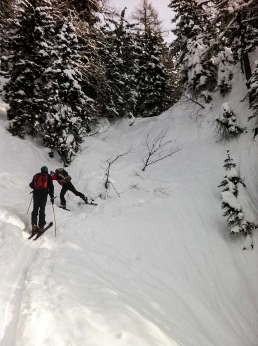 Die Abfahrt beginnt kurz unterhalb des Gipfels (2. Rinne vom Gipfel weg gezählt) in einer breiten Rinne die nach unten hin etwas schmäler wird. Kur vor der Baumgrenze ist eine kurze Steilstufe zu überwinden, anschließend geht es durch lichten Wald bergab. Bei der 2. Forststraße folgt man dieser für 100m Richtung Westen um anschließend weiter in lichtem Wald bis zur Hörantalm abzufahren. Die Alm passiert man links und fährt weiter auf offener Fläche parallel zur Aufstiegsspur ab. Ab der Forststraßenkreuzung weiter entlang der Aufstiegsspur.