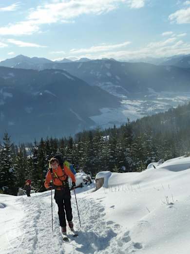 Die Gegend im Toten Gebirge um Wörschach ist bekannt für große Schneehöhen, sodass es vorkommen kann, dass man neben meterhohen Schneewänden aufsteigt. Vielleicht auch bei dieser Tour vom Gasthof Panoramablick auf den 1.912 m hohen Raidling. Die Strecke auf den schönen Aussichtsberg ist nicht allzu schwer, aber besonders der Grazer Steig sollte nur bei sicheren Verhältnissen beschritten werden, da die Wände ober- und unterhalb des Weges sehr steil sind.