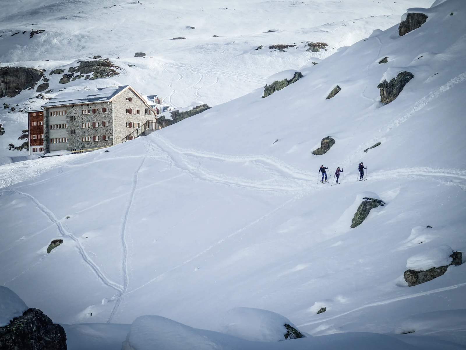 Oder aber man macht eine lange Querung nach Westen zum Steinmali, 2.353 m, und fährt von dort direkt zur Jamtalhütte ab.