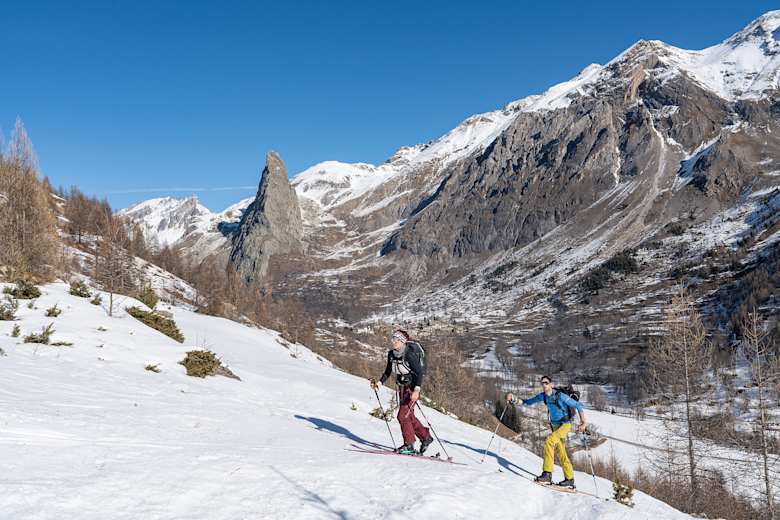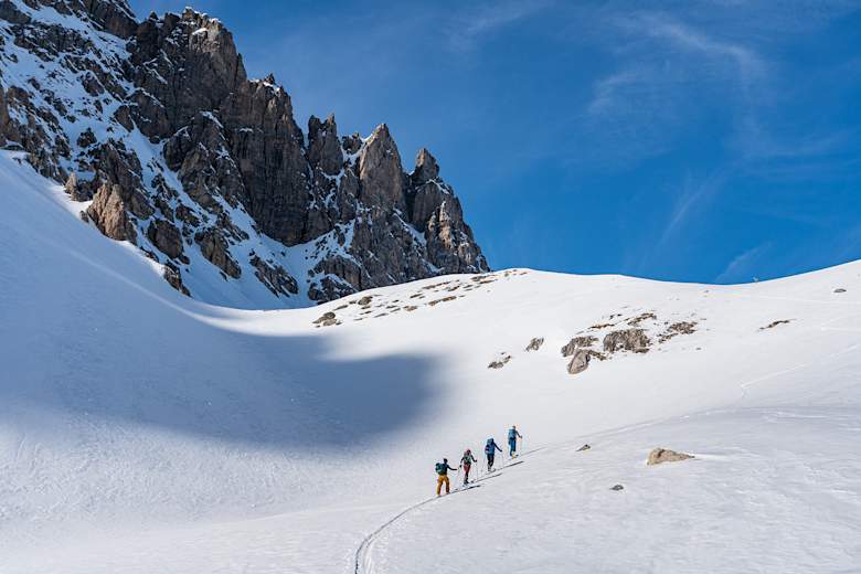 Bei Frühjahresverhältnissen bietet sich die Abfahrt an der Aufstiegsspur an, hier bekommt man bei den richtigen Bedingungen guten Firn. Wer den Pulverschnee sucht, nimmt den zweiten kurzen Aufstieg unter dem Monte Sautron in Kauf, hier findet sich ein schattiges und windgeschütztes Kar.