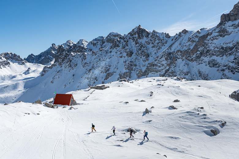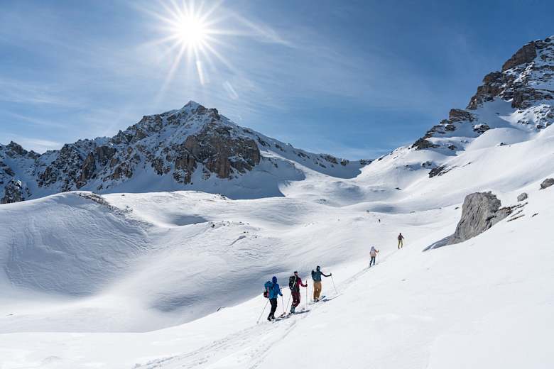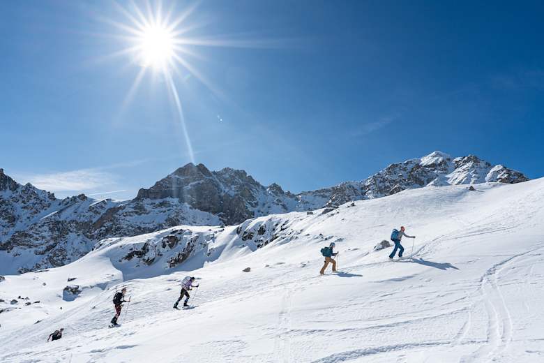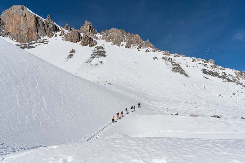 Abfahrt entweder entlang der Aufstiegsspur, oder als Variante über einen zweiten, kurzen Anstieg auf ein kleines Kar (2.681 m) in nördlicher Richtung unterhalb des Monte Sautron. Abfahrt in Richtung der Rocca Rossa, wo wir am Grange Pausa wieder auf unsere Aufstiegsspur treffen.