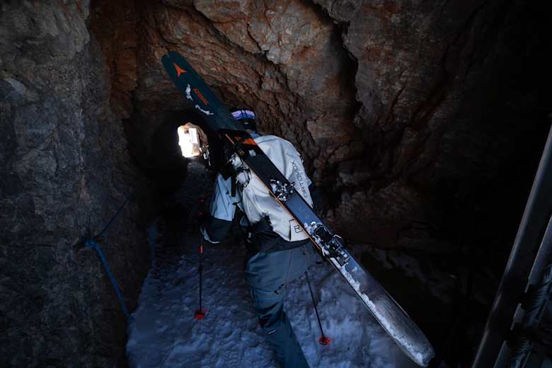 Abfahrt von der Dachstein Bergstation bis zur Austriascharte östlich vom Hunerkogel. Kurzer Aufstieg (Ski werden am Rucksack befestigt) bis zur berüchtigten, 30 Meter langen Leiter die zum Rosmariestollen führt. Gesichert mit Gurt und Klettersteigset (kann natürlich auch frei gegangen werden) kletterst du die Leiter bis zur Stollentür hinauf - der Stollen wird von den Gletscherbahnen geöffnet und freigeschaufelt.