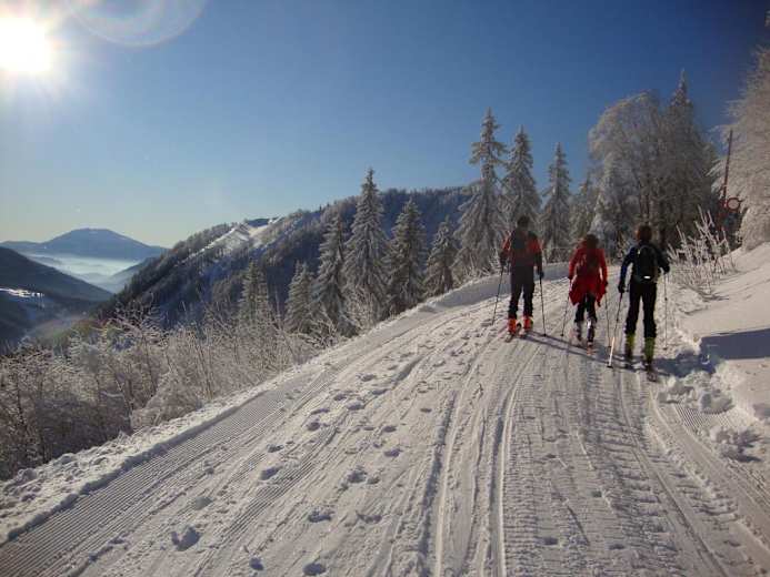Normalaufstieg auf den niederösterreichischen Muckenkogel (1.248 m) zur Lilienfelder Hütte (956 m) über die Skipiste, Abfahrt über Kesselboden und alte Lifttrasse. Einer der Klassiker unter den Voralpentouren mit ca. 900 Hm. Wegen der einfachen Wegführung, Lawinensicherheit auf der Hauptroute, guten Infrastruktur und leichten Erreichbarkeit – von St. Pölten sind es nur 20 Minuten - wird diese Tour sehr oft begangen.