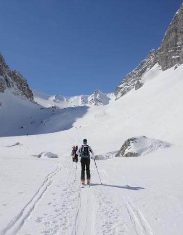 Von hier geht es nun links den mit Gebüsch bewachsenen Graben bergan, um in einem weiten Bogen nach Nordwest ins breite, wunderschöne Südkar zu gelangen. Unter der Kreuzmauer gehen wir noch rechts auf einen Rücken hinauf auf dem wir bis zum felsigen Gipfelaufbau ansteigt (Skidepot!).
