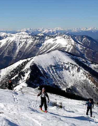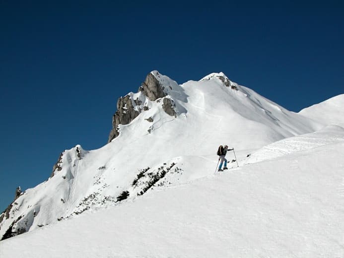 Mit den Skiern kann man nur bei sehr guten Verhältnissen bis zum Gipfel aufsteigen. Ebenso ist zu beachten, dass die Steilabfahrt vom Gipfel nur für absolute Top-Tourengeher geeignet ist.