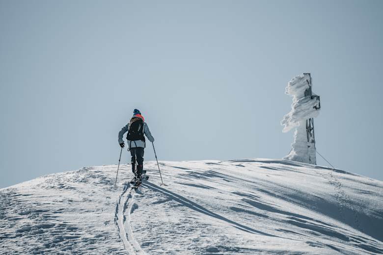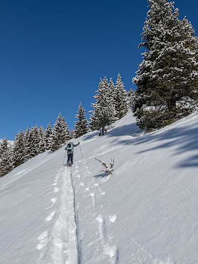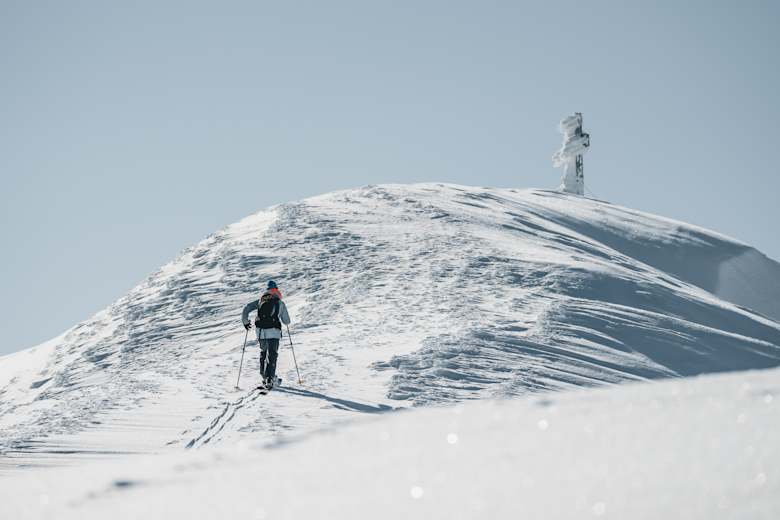 Die Route verläuft über weitläufiges, meist gut einsehbares Gelände – entweder direkt am Pistenrand oder pistennah im freien Gelände. Dadurch ist die Orientierung einfach. Abgesehen von einer etwas steileren Passage im unteren Bereich ist der Anstieg überwiegend flach bis leicht kupiert. Von der Bergstation führt ein kurzer Schlussanstieg (ca. 5–10 Minuten) zum Gipfelkreuz.