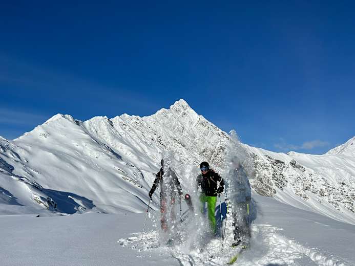 Vom Gipfel leicht nach Süden queren, dann über die breiten, offenen Hänge ins Weitental abfahren. Die Hänge sind mäßig steil und in guten Bedingungen sehr angenehm zu fahren. Bevor das Tal zu flach wird, den Bach queren und die östlichen Hänge für den Aufstieg zum Tuxerjochhaus nützen.