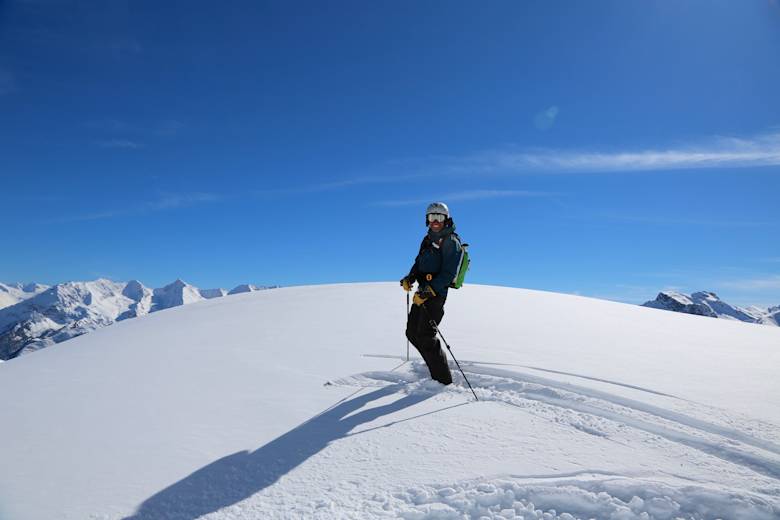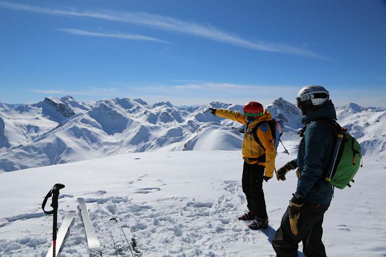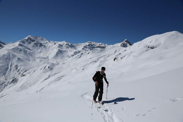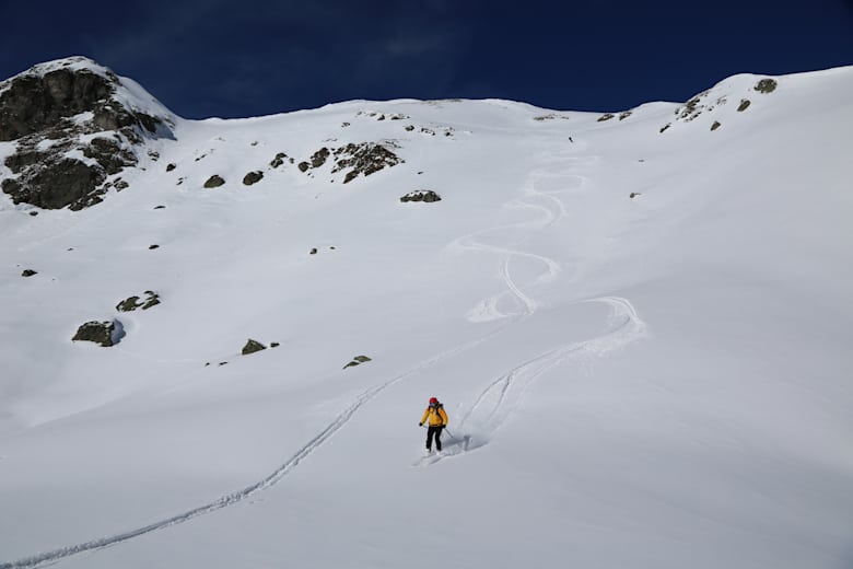Die Abfahrt erfolgt über die Aufstiegsroute oder bei stabiler Schneelage über Variantenhänge unterhalb des Gipfels, die eine längere, abwechslungsreiche Abfahrt ermöglichen.