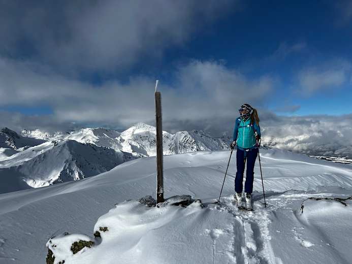Die Abfahrt erfolgt über die Aufstiegsroute oder bei stabiler Schneelage über Variantenhänge unterhalb des Gipfels, die eine längere, abwechslungsreiche Abfahrt ermöglichen.