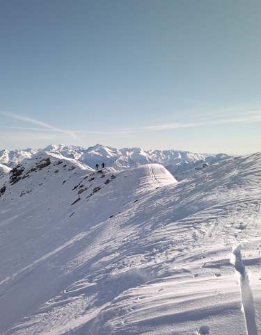 Konditionsstarke Tourengeher können nach einer kurzen Steilabfahrt auch den etwas höheren Nebengipfel auf 2.445 m erklimmen.