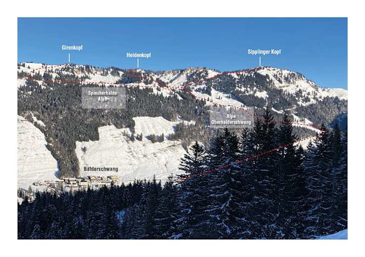 Die Skitour von Balderschwang zur Sennalpe Oberbalderschwang, 1.370 m, in den Allgäuer Alpen ist eine ideale Route für die ersten Schritte auf Tourenski. Ausgangspunkt ist der Ortskern von Balderschwang, wo man bequem von der Bushaltestelle oder dem Parkplatz nahe der Kirche starten kann.