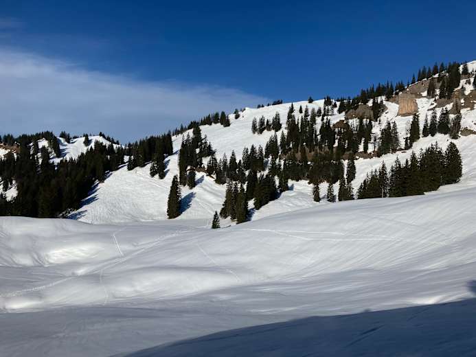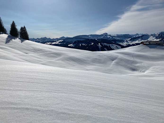 Für die Abfahrt stehen im oberen Bereich mit dem herrlichen Gipfelhang zahlreiche Varianten zur Auswahl. Ab der kleinen Mulde vor der Spicheralpe auf der Aufstiegsroute hinab zur Alpe Oberbalderschwang.