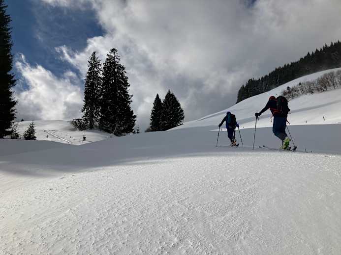 Von der Alpe Oberbalderschwang durch eine flache Mulde in Richtung Nordwesten wie bei Heidenkopf und Siplinger. Nach rund 100 Höhenmetern wird das Gelände kurz flach und man quert die Ebene in Richtung Westen, um den deutlich zu erkennenden Fahrweg zur Alpe Spicherhalde zu erreichen. Diesen kurz etwas steiler hinauf und westlich flach zur bereits sichtbaren Hütte. Von der Hütte ca. 30 Höhenmeter bergab in eine Mulde (alle anderen Varianten, mit denen man glaubt, diesen Abstieg zu vermeiden, führen zu Nichts! Die Felle können aufgezogen bleiben).
